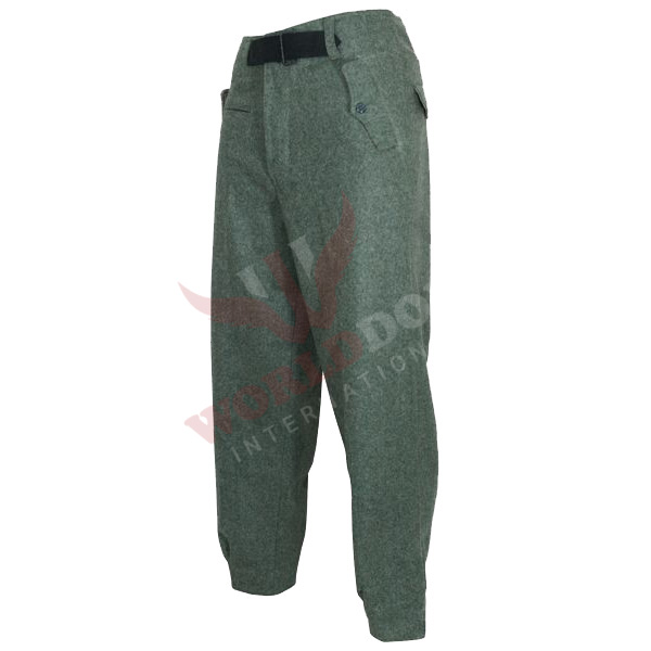 Made of field grey wool, and feature the Army design with the internal belt at the waist and single-buttoned pockets. They also have a small tie and button at the base of each leg, as per the originals.