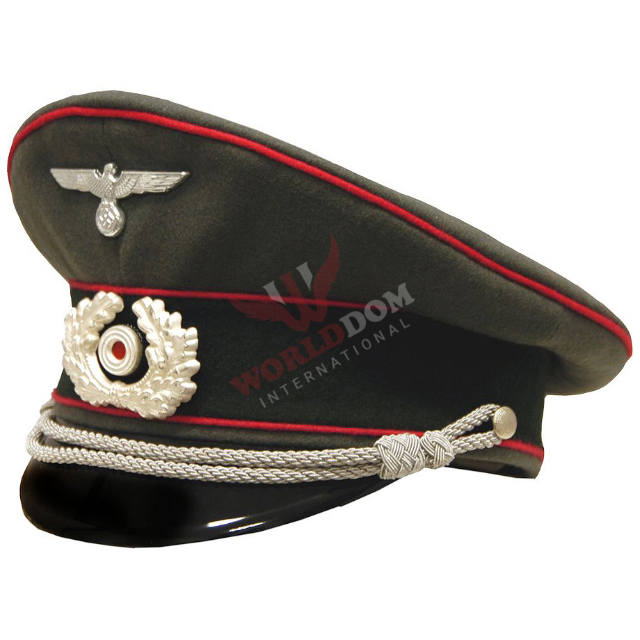Officers' caps feature doeskin or Trikot wool in field grey, with dark, bluish-green wool cap bands, pink wool piping, silver bullion chin cords, and fine quality silver colored insignia.
