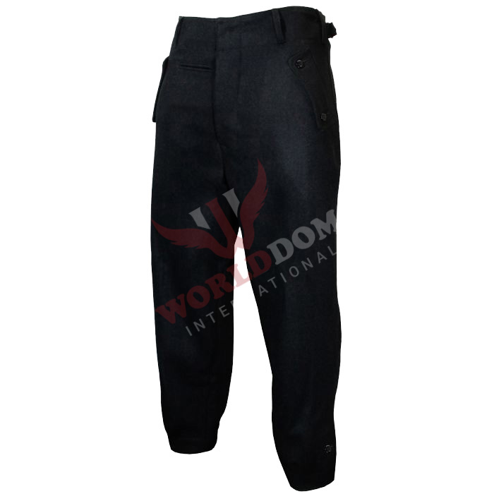 Made from black wool, and feature the SS design of buckled side-straps at the waist for adjustment and buttoned pockets. They also have a small tie and button at the base of each leg, as per the originals.