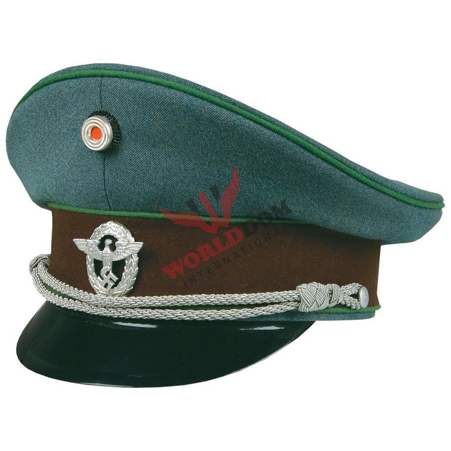 This National Police visor cap is the traditional military “saddle” form with high peak, unique bluish-green whipcord wool top, bright green piping, dark brown cap band and silver bullion chincord.