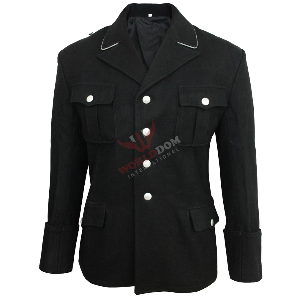 4 button front and open collar. These tunics have the correct cut and are made from a fine quality black wool with silver piping around the collar and a satin viscose blend lining.