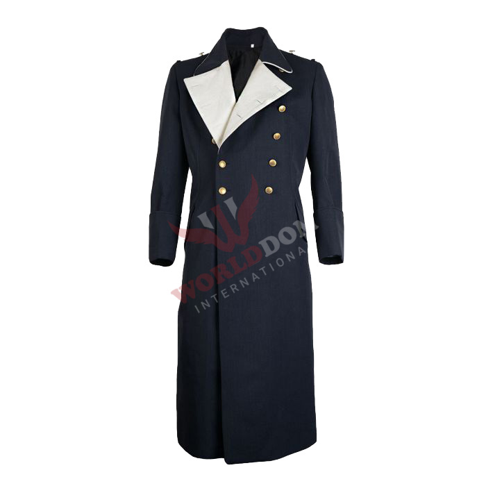 Featuring a white piped collar, shoulder board loops and buttons, sleeve cuffs, and authentic gold pebbled buttons, these overcoats are excellent reproductions of the originals. The coats have two front pockets and a single pocket inside.
