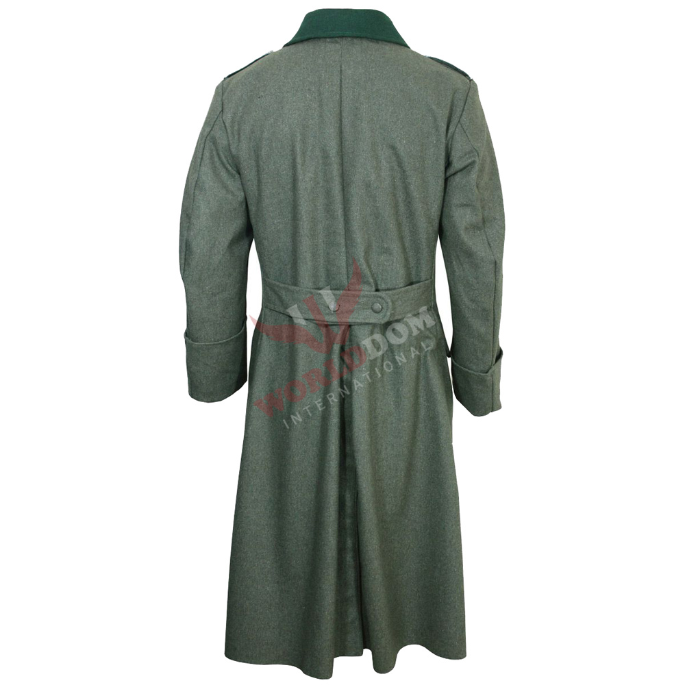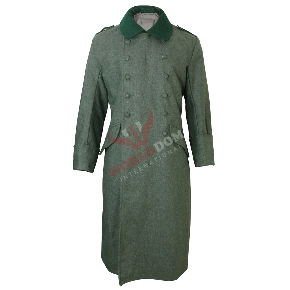 Made of 80% wool. The front of the coat is finished with a series of green pebbled buttons. They also have a pair of field grey shoulder boards on the shoulders and a pair of pockets at the sides.